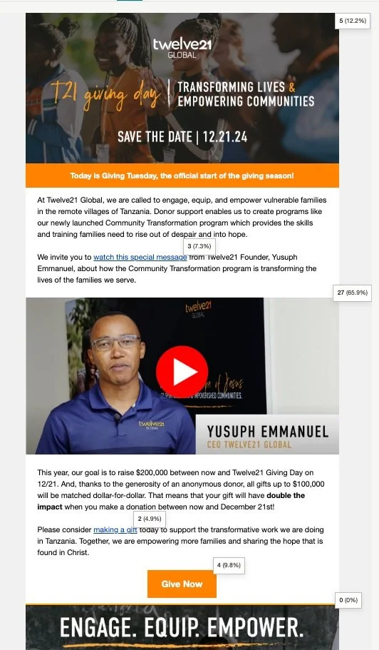 These emails transitioned from storytelling to direct appeals for donations, including impact messages and examples of how donations ensure the continued impact of Twelve21.
